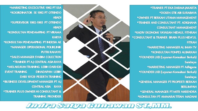 Indra Satya Gunawan ST,.MM adalah seorang praktisi Sumber Daya Manusia, Master Trainer Motivasi, Spiritual dan Teamwork, Pengusaha dibidang Industri training, serta pembicara publik di acara seminar, workshop dan inhouse training. Beliau sudah cukup berpengalaman didalam dunia kerja, berikut pengalaman beliau selama didunia kerja.