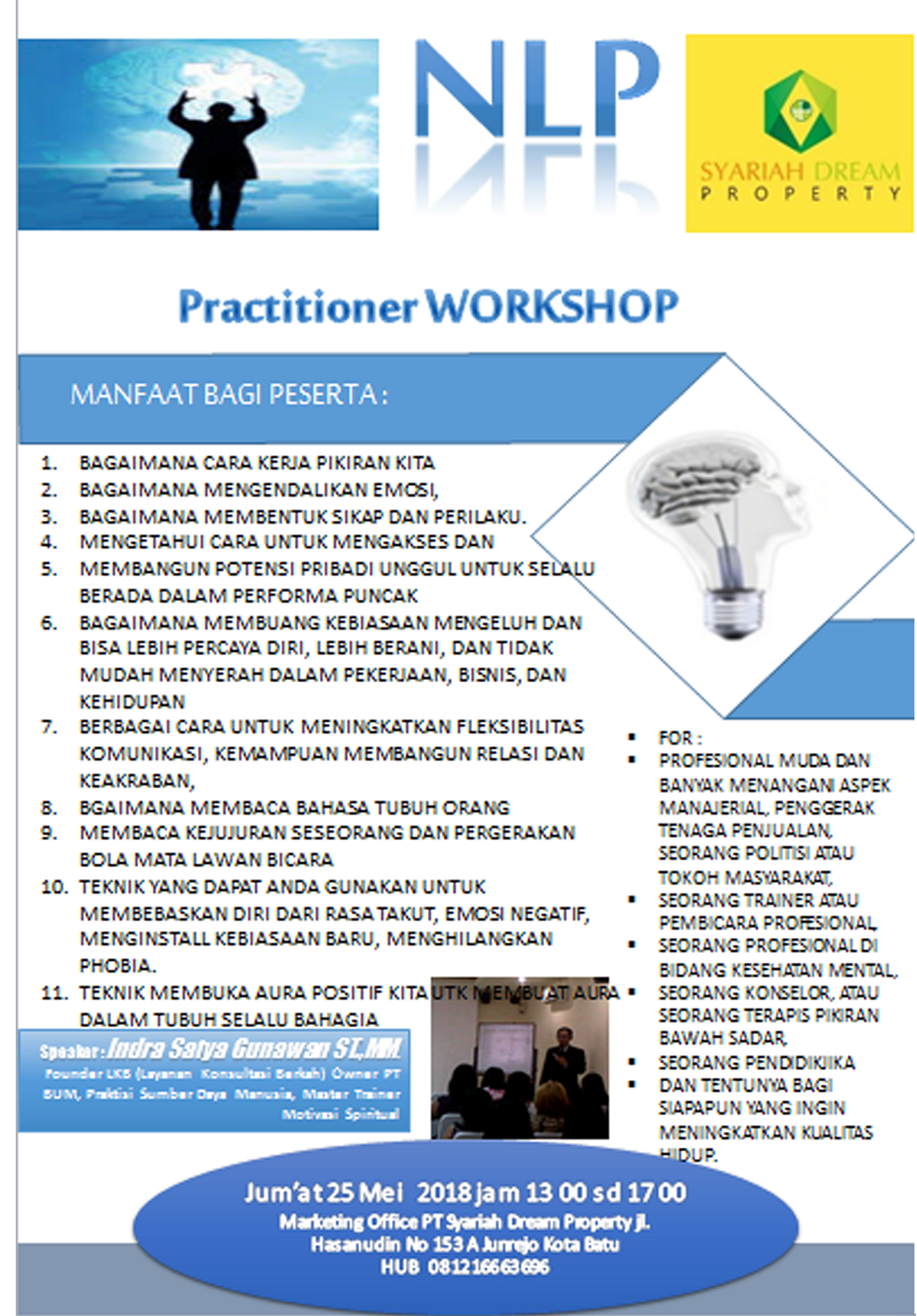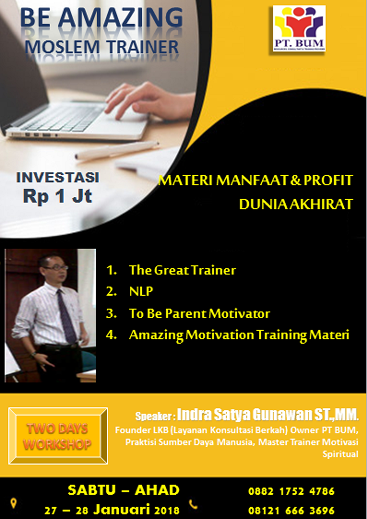 Trainer : Indra Satya Gunawan ST.,MM. (Founder LKB (Layanan Konsultasi Berkah) Owner PT BUM, Praktisi Sumber Daya Manusia, Master Trainer Motivasi Spiritual)