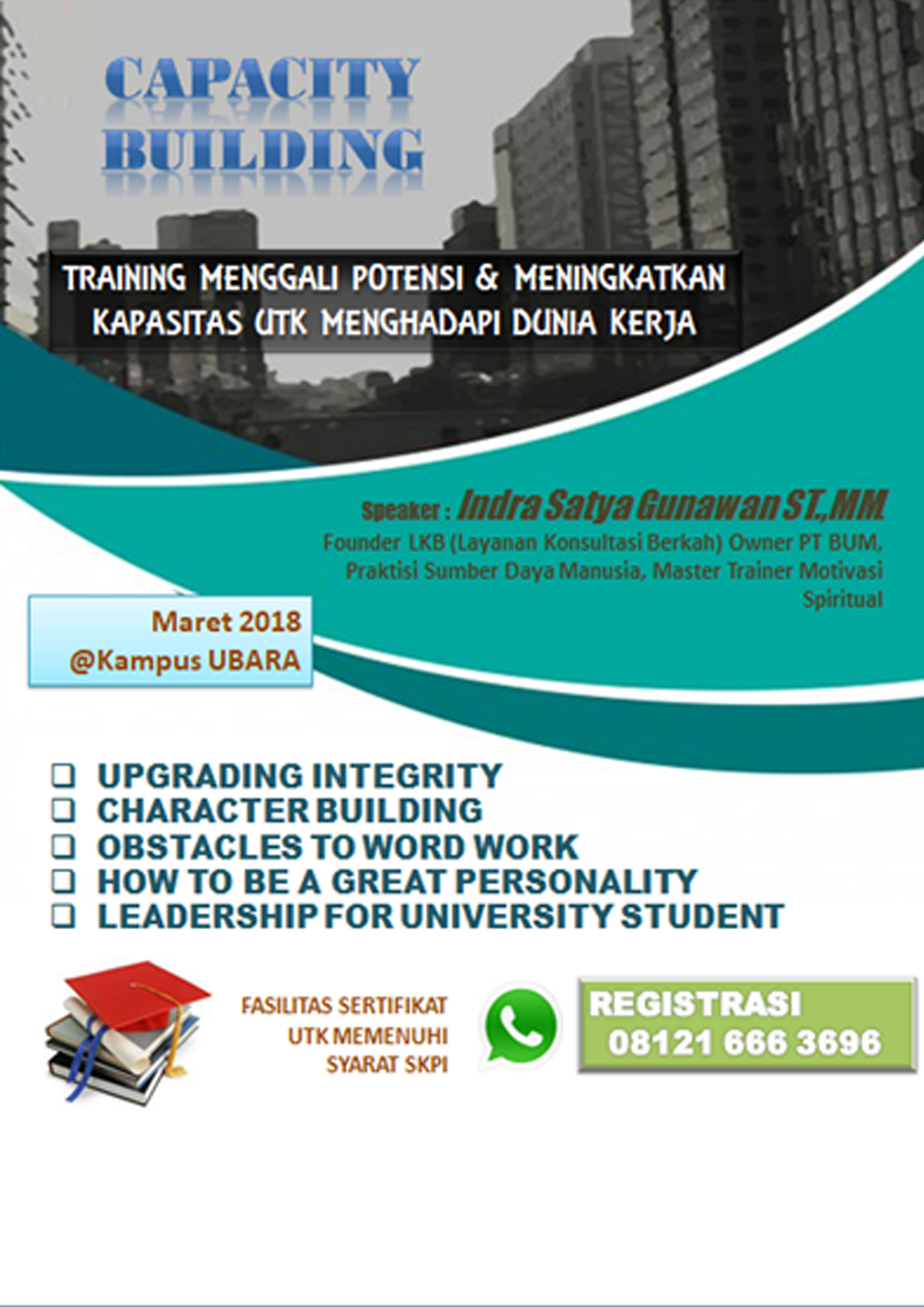 Pembicara : Indra Satya Gunawan ST.,MM. (Founder LKB (Layanan Konsultasi Berkah) Owner PT BUM, Praktisi Sumber Daya Manusia, Master Trainer Motivasi Spiritual)