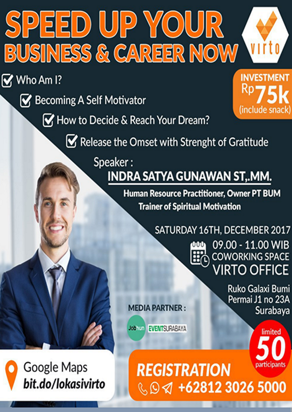 Tempat : Coworking Space Virto Office, Ruko Galaksi Bumi Permai J1 No. 23A, Surabaya