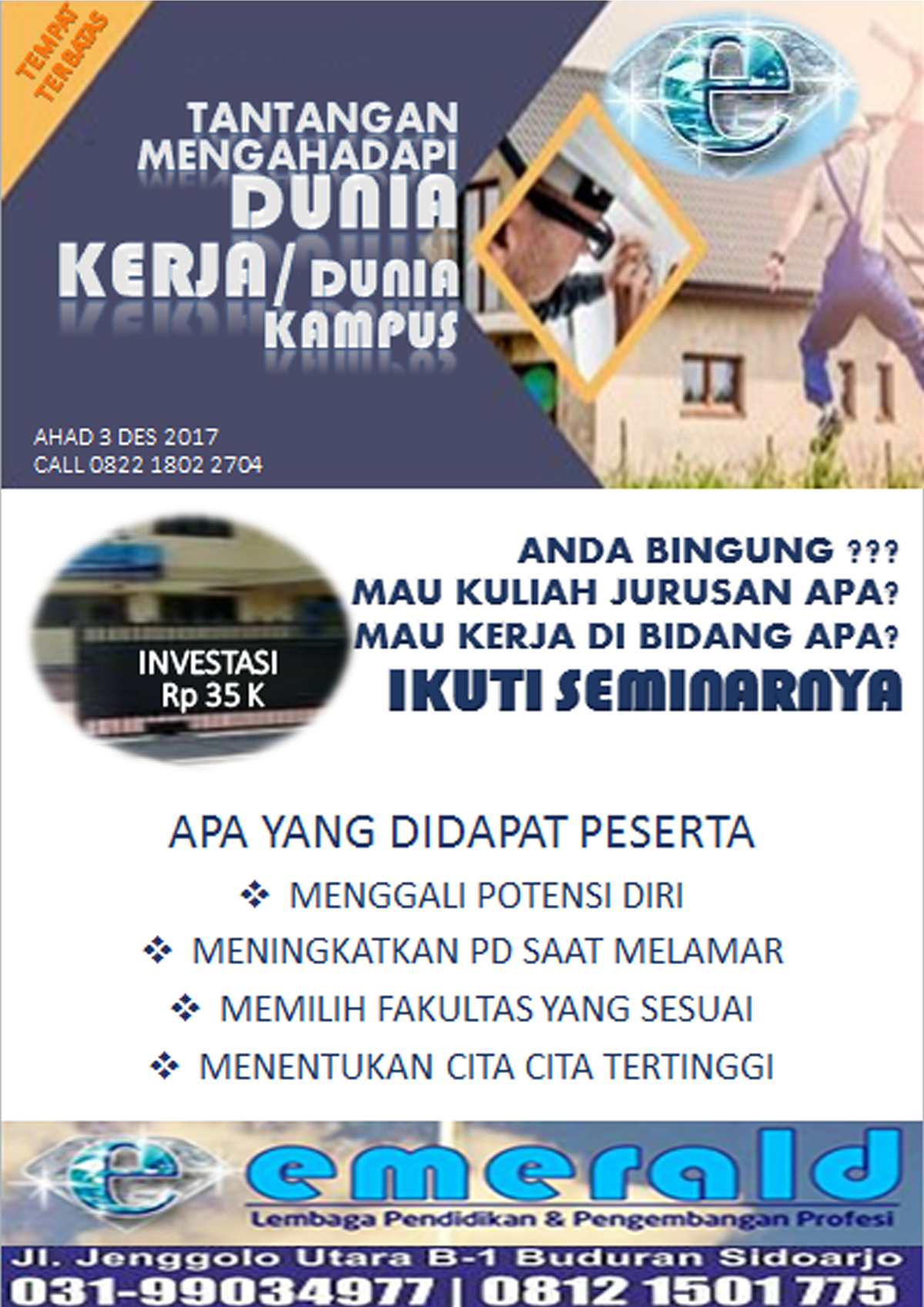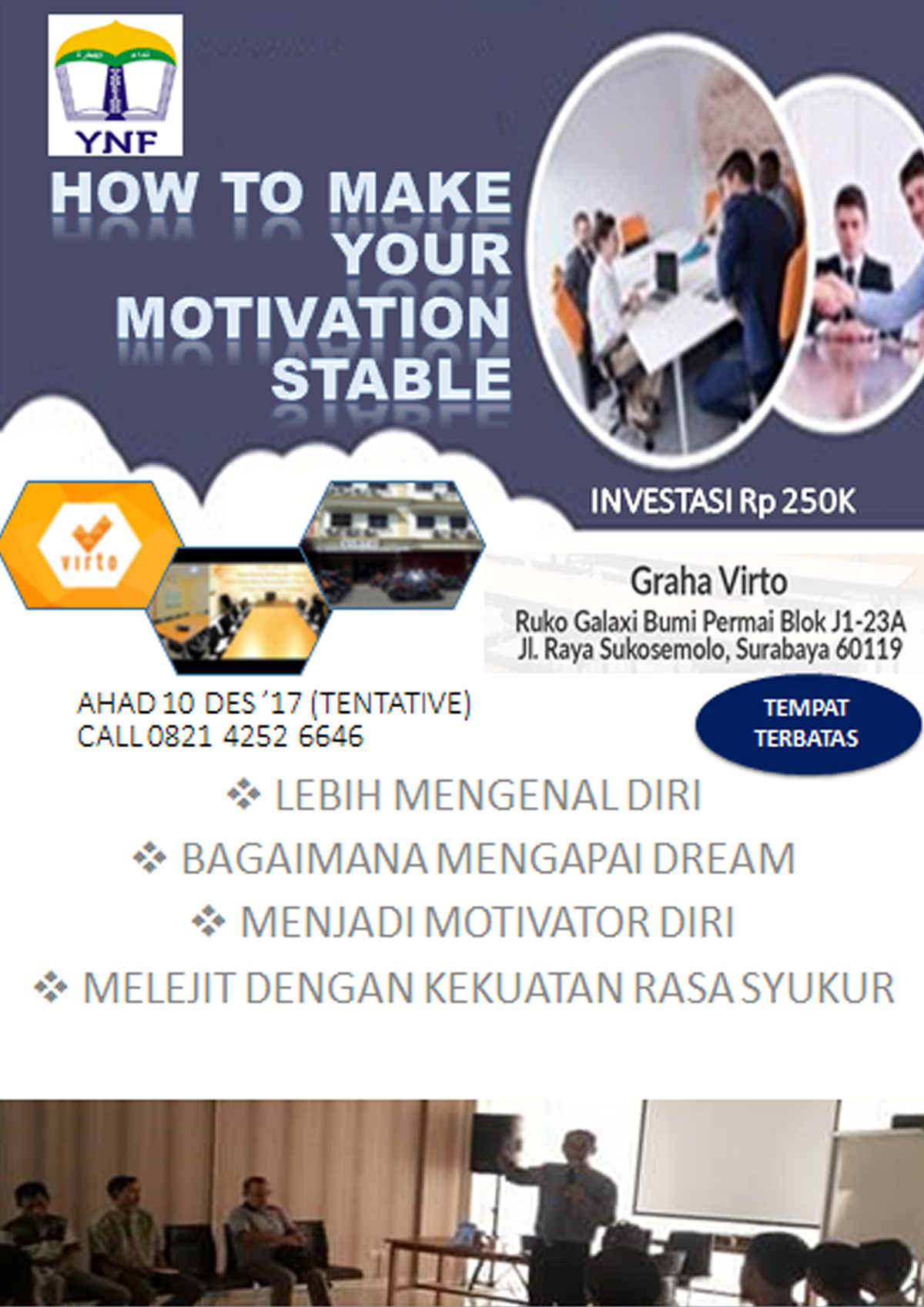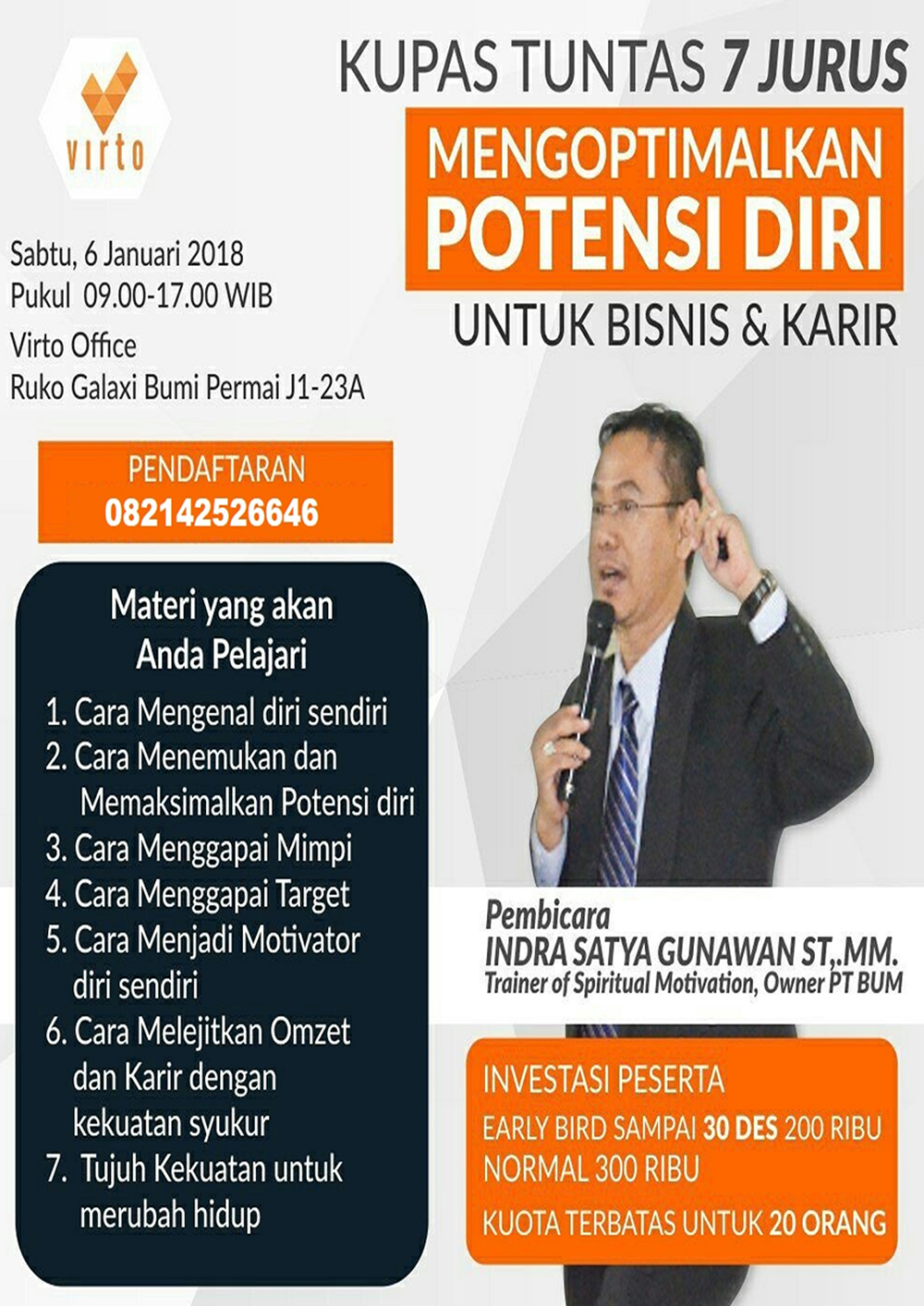 Investasi : Early Bird sampai 30 Desember 2017 : Rp. 200.000,-